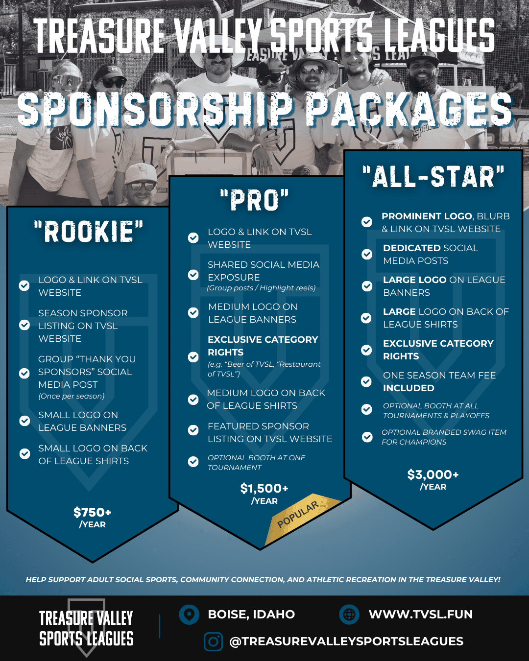 At Treasure Valley Sports Leagues, we believe the strongest communities are built when local businesses and local people grow together. Rooted right here in Boise, our sponsorship program is designed to create real connections - helping businesses increase visibility, engage authentically with our players, and become part of the community that makes the Treasure Valley feel like home.